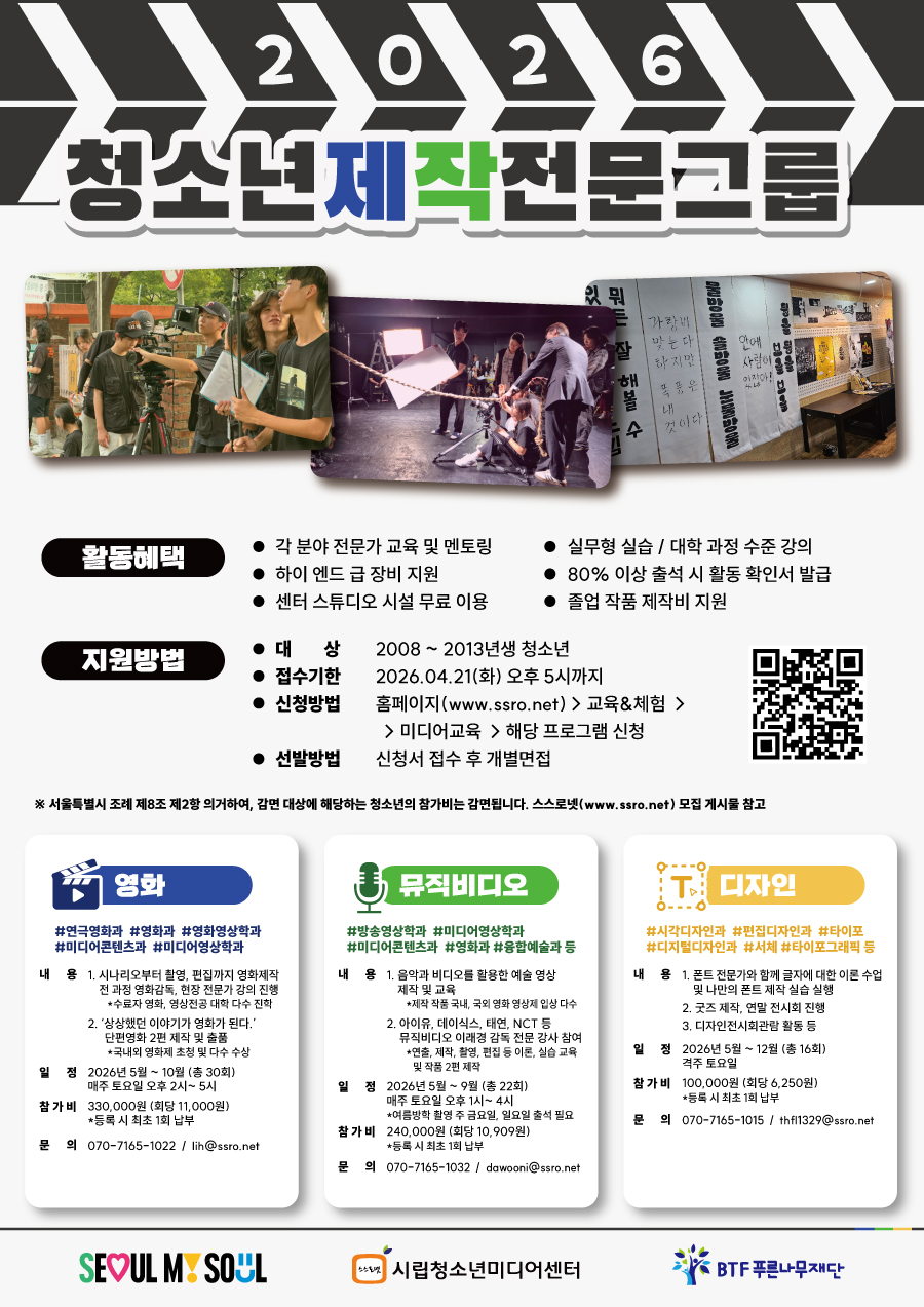| [모집] 2026 영화/MV/서체디자인 전문과정 참가 청소년 모집(~4/21) | |||